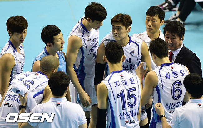 2세트 삼성화재 신치용 감독이 작전지시를 하고 있다.