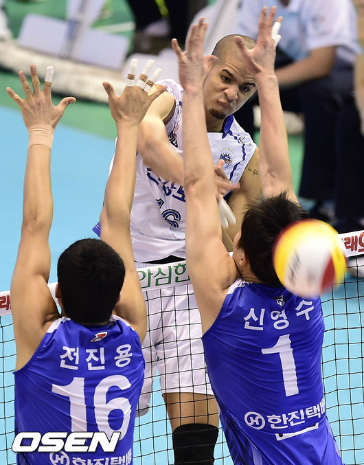대전 삼성화재 블루팡스가 16일 대전 충무체육관에서 열린 2014-2015시즌 NH농협 V리그 남자부 인천 대한항공 점보스와 경기서 세트스코어 3-0(25-17, 25-19, 25-18) 완승을 거뒀다.