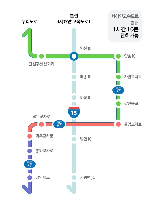 교통량이 가장 많은 시간대에 최대 1시간 27분을 절약할 수 있는 우회도로는 ▲ 경부고속도로 신갈JC→신탄진IC가 막힐 경우 / 17번국도 이용 (1시간 19분 단축) ▲ 서해안고속도로 시흥시청→서평택IC가 막힐 경우 / 39번국도→82번국도→77번국도 이용 (1시간 10분 단축) ▲ 영동고속도로 서창JC→원주IC가 막힐 경우 / 서울외곽순환도로→42번국도 이용 (1시간 27분 단축) ▲ 중부고속도로 하남JC→서청주IC가 막힐 경우 / 45번국도→17번국도를 이용(50분 단축)하면 된다.