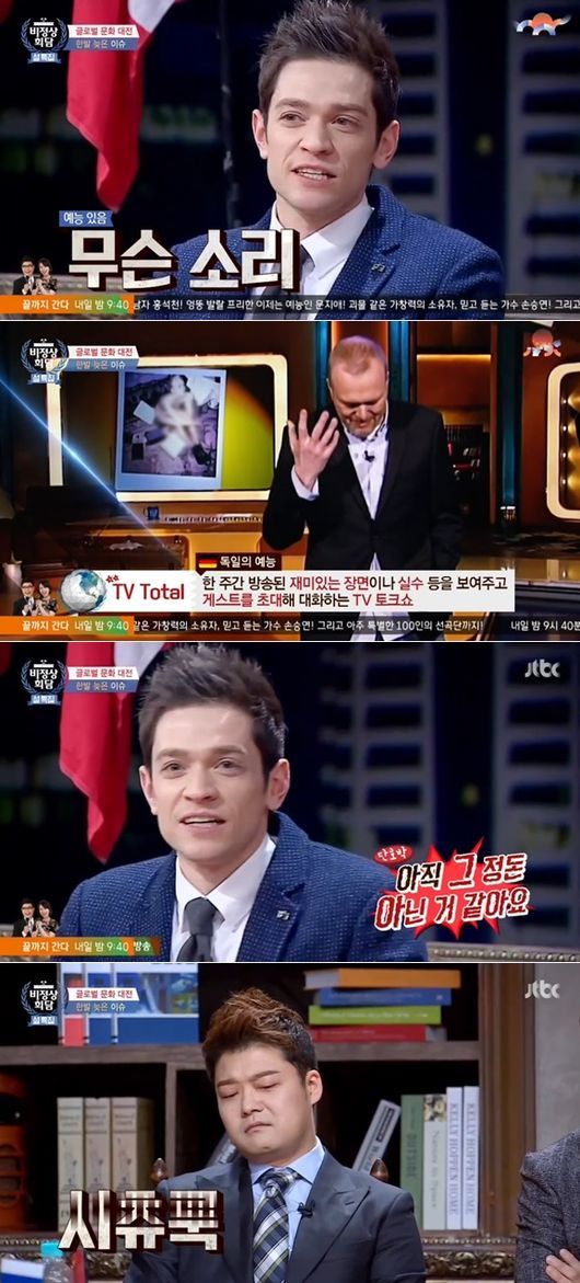다니엘은 16일 오후 방송된 JTBC 예능프로그램 ‘비정상회담’의 ‘늦었슈’ 코너에서 독일의 예능 프로그램에 대한 이야기를 꺼냈다. 평소 재미가 부족한 ‘독일 유머’로 놀림을 받은 다니엘에 MC들이 “예능도 그렇냐”고 물은 것.
