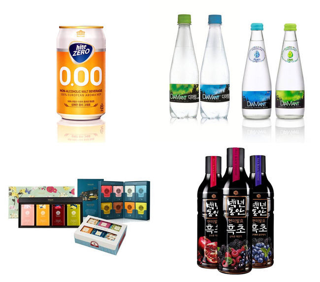 (왼쪽 위부터 시계방향) 하이트진로음료 '하이트제로0.00', 하이트진로음료 '디아망', 샘표 '백년동안', 오설록 '설 선물세트'