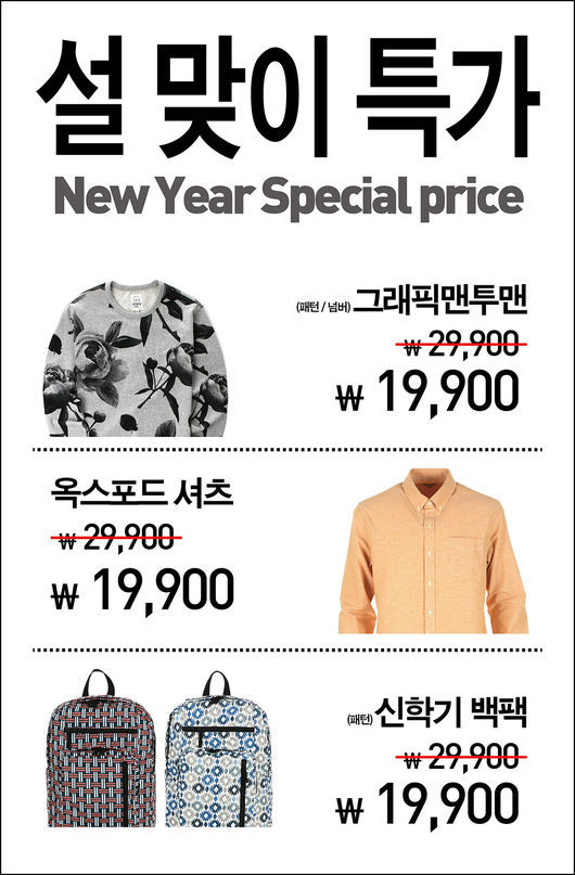 이번 이벤트는 그래픽 맨투맨 티셔츠와 옥스포드 셔츠, 백팩 모두 1만 9900원이라는 파격적인 가격에 구입할 수 있도록 다양한 할인 혜택을 선보였다. 데일리 아이템으로 제격인 맨투맨 티셔츠는 경쾌한 패턴과 숫자가 새겨져 유니크한 디자인으로 캐주얼이나 스마트한 세미 정장에도 매치가 쉬어 실용적이다.