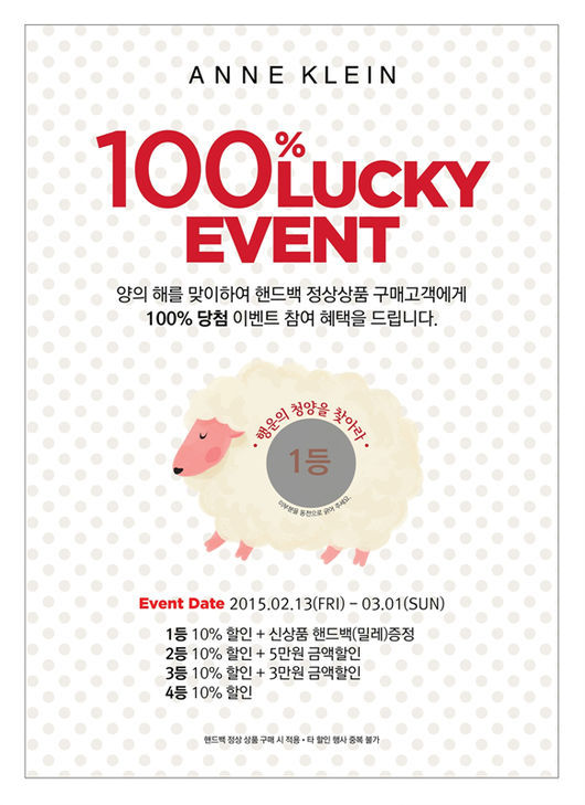 모던하고 세련된 디자인으로 사랑 받는 핸드백 브랜드 앤클라인에서 2015 청양의 해를 맞아 13일부터 오는 3월 1일까지 '양 캐릭터 스크레치 카드' 증정 이벤트인 '행운의 청양을 찾아라'를 진행한다.