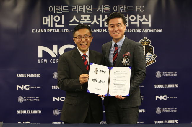 서울 이랜드의 박상균 대표이사와 ‘이랜드 리테일’ 이광일 대표는 17일 서울 신촌 이랜드 리테일 본사에서 전략적 파트너십 조인식을 갖고 5년간 구단의 메인스폰서로서 이랜드 리테일의 성공적인 마케팅과 차별화된 서비스 구현을 위한 파트너십 활동에 대한 계약을 체결했다.