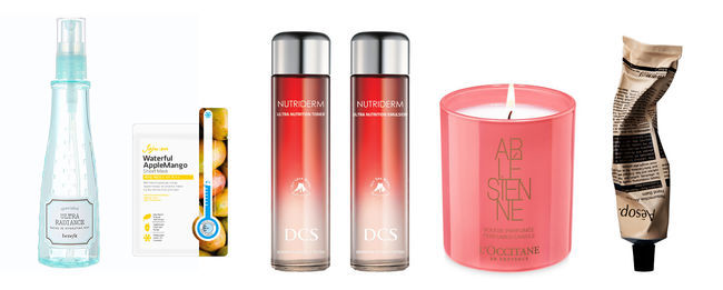 왼쪽부터 베네피트 울트라 래디언스 페이셜 리하이드레이팅 미스트, 제주엔 워터풀 애플망고 시트 마스크,DCS 울트라 뉴트리션 토너, DCS 울트라 뉴트리션 에멀전, 록시땅 아를레지엔느 캔들, 이솝 레저렉션 아로마틱 핸드 밤.