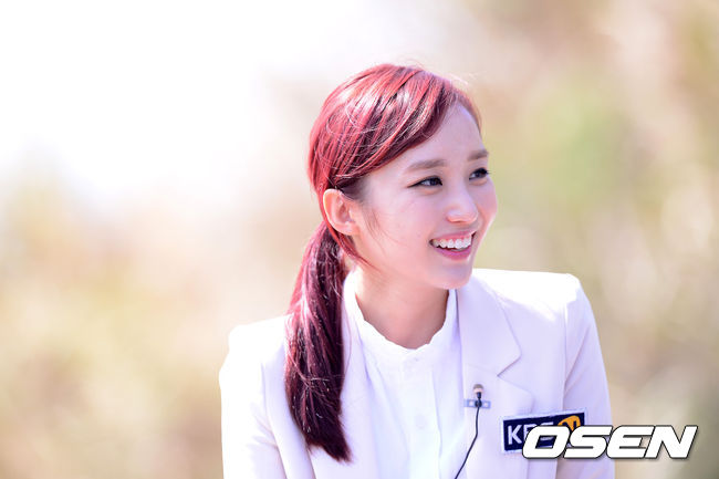 윤태진 KBSN 아나운서가 관중석에서 방송 준비를 하며 미소짓고 있다./jpnews@osen.co.kr