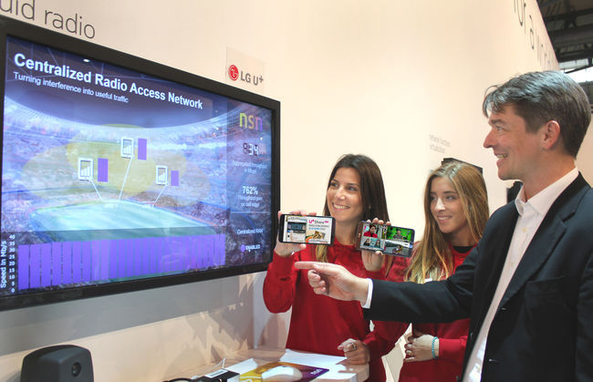 지난해 'MWC) 2014'에서 LG유플러스가 LTE-A(Advanced) 핵심기술인 향상된 업링크 콤프(Enhanced Uplink Cooperative Multi-Point)' 기술을 시연하는 모습. / LG유플러스 제공