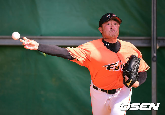 임경완이 불펜피칭을 하고 있다.