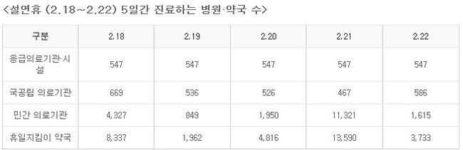 전국 547개 응급의료기관·응급의료시설은 평소와 동일하게 24시간 운영되고, 다수의 민간 의료기관이 문을 닫는 설 당일과 그 다음날에도 보건소를 비롯한 국공립 의료기관은 진료를 계속한다.
