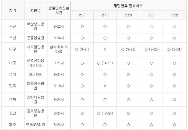 부산성모병원, 부산 온종합병원, 대구 한영한마음아동병원, 평택 성세병원, 김천제일병원, 김해중앙병원, 제주연동365의원 7개병원은 연휴기간 동안 계속 진료하며 대구 시지열린병원, 전주 다솔아동병원 2개병원은 설 당일에만 휴진한다.