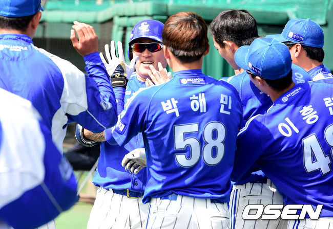 3회초 1사에서 삼성 최형우가 솔로포를 날리고 동료선수들과 하이파이브를 하고 있다.
