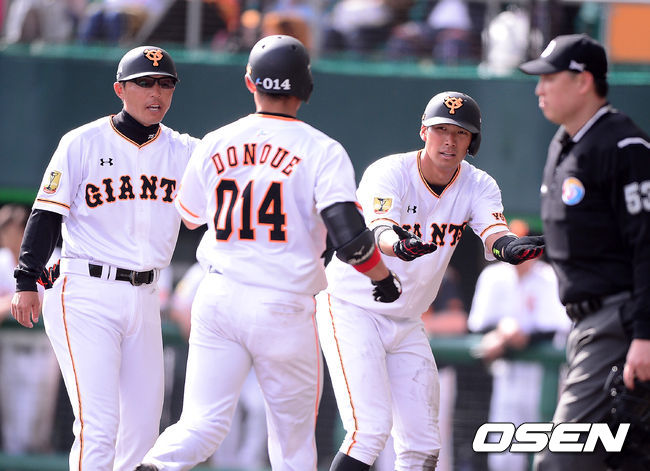 7회말 1사 2,3루에서 요미우리 도노우에가 스리런포를 날리고 홈을 밟으며 하이파이브를 하고 있다.