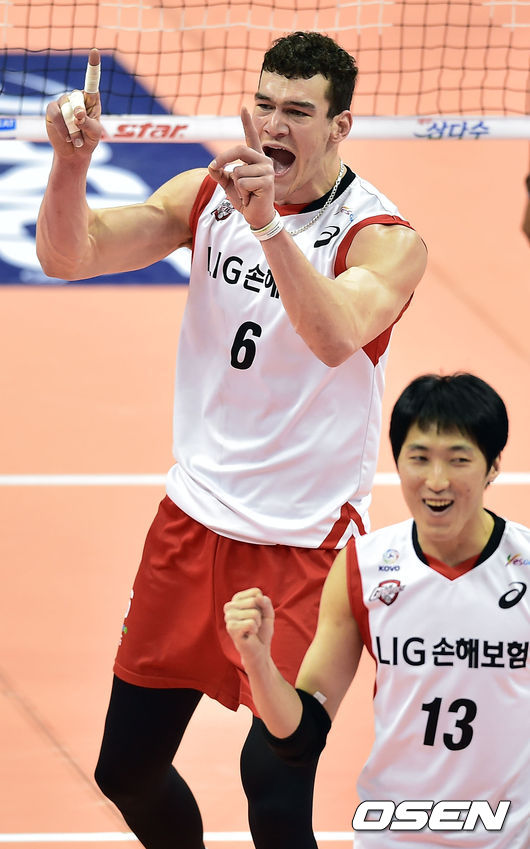 18일 오후 경북 구미시 박정희체육관서 열린 2014~2015 V-리그 LIG손해보험와 OK저축은행의 경기, 2세트 LIG손해보험 에드가가 세트종료 후 기뻐하고 있다.