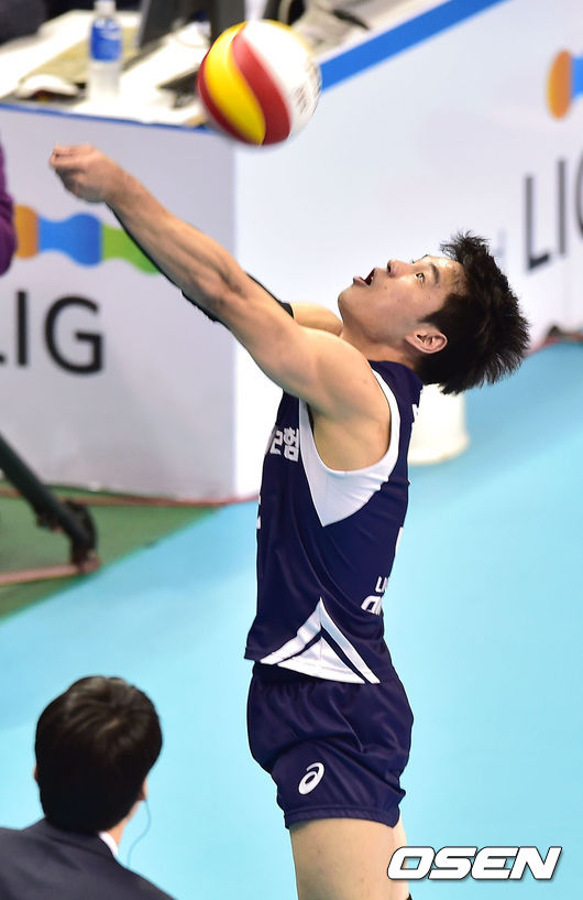18일 오후 경북 구미시 박정희체육관서 열린 2014~2015 V-리그 LIG손해보험와 OK저축은행의 경기, 2세트 LIG손해보험 부용찬이 리시브를 하고 있다