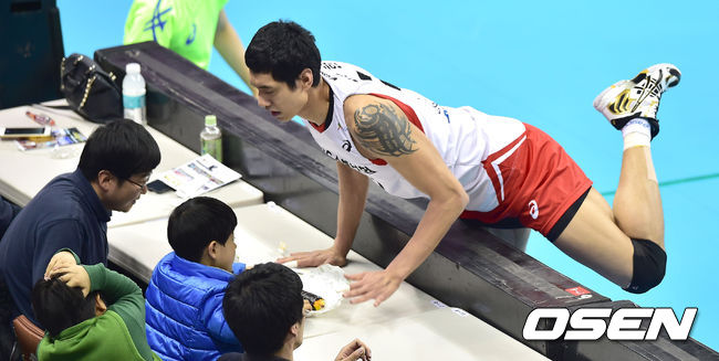 18일 오후 경북 구미시 박정희체육관서 열린 2014~2015 V-리그 LIG손해보험와 OK저축은행의 경기, 1세트 LIG 김요한이 공을 살리기 위해 관중석으로 몸을 날리고 있다.