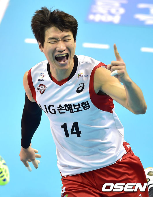 18일 오후 경북 구미시 박정희체육관서 열린 2014~2015 V-리그 LIG손해보험와 OK저축은행의 경기, 1세트 LIG 김진만이 득점 후 환호하고 있다