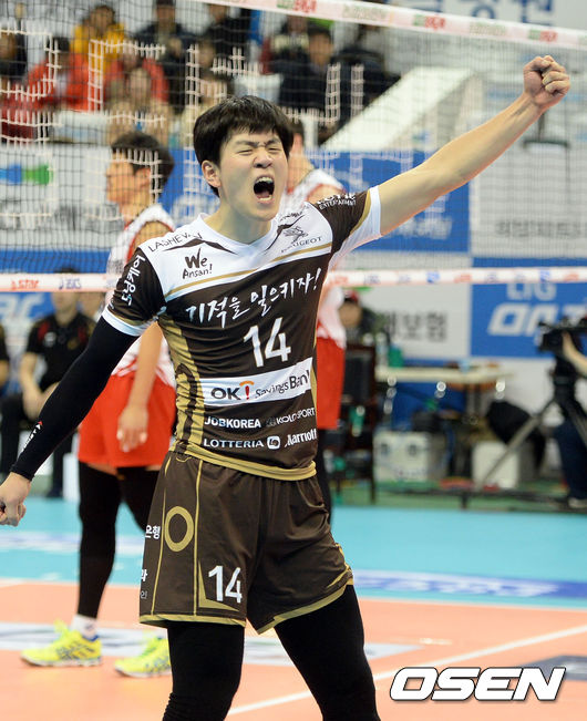 18일 오후 경북 구미시 박정희체육관서 열린 2014~2015 V-리그 LIG손해보험와 OK저축은행의 경기,블로킹으로 4세트를 종료 시킨 OK저축은행 송희채가 환호하고 있다.
