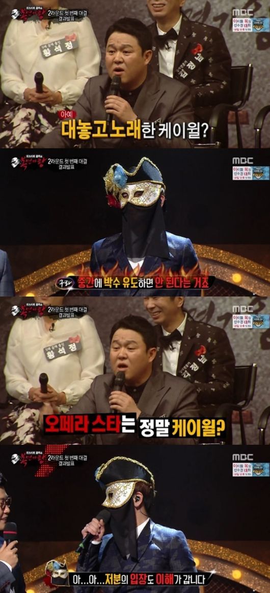 김구라는 두 사람의 노래를 들은 뒤 “가면을 쓰고 있는데 ‘나 케이윌이다’라고 말하고 있다. 직무유기다. 오렌지양은 중간에 춤을 추지도 않았다. 케이윌 비겁하다. 그러면 ‘나는 가수다’를 나가야 한다”라고 말했다.