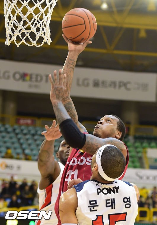 1쿼터, LG 제퍼슨이 모비스 라틀리프와 문태영 수비를 뚫고 슛을 하고 있다.