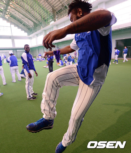 민족대명절 설을 맞아 선수단이 코칭스태프, 투수, 야수, 프런트 팀으로 나워 제기차기 내기를 했다. 나바로가 피가로가 보는 앞에서 제기차기 시범을 선보이고 있다.