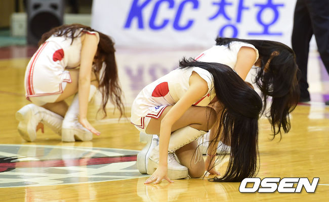 치어리더들이 농구팬들을 향해 세배를 하고 있다.