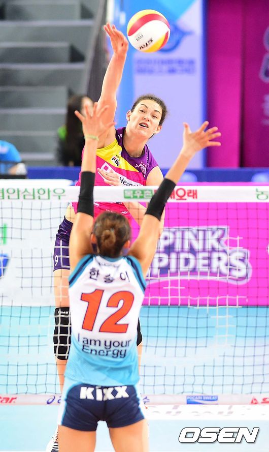 1세트, 흥국생명 루크가 GS칼텍스 한송이의 블로킹을 피해 공격을 시도하고 있다.