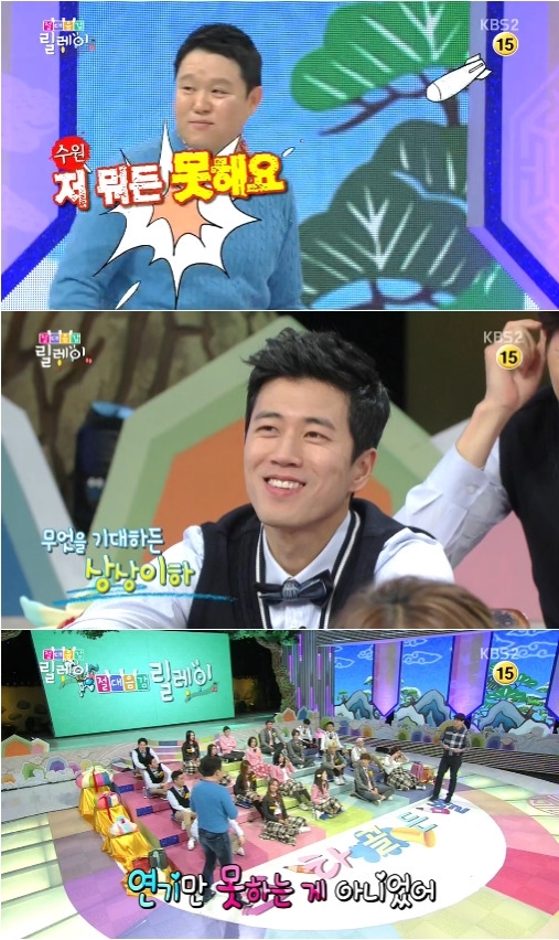 이날 장수원은 문희준, 데니안, 은지원 등과 함께 '스'라인에 속해 게임에 임했다. 장수원은 '절대음감 릴레이' 코너에서 '통팝두텁떡' 발음이 유난히 꼬였고, 덕분에 '스'라인은 실패했다. 이에 MC 김구라는 "장수원이 너무 못했다"고 말했고, 이에 장수원은 "전 뭐든 다 못한다"고 웃었다.