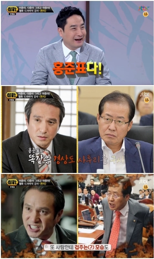 홍지사의 이같은 발언은 극중 인물 이태준(조재현 분)과 그가 말투가 비슷하다는 평가를 받은 터라 더 시선이 쏠린다. 강용석은 최근 JTBC '썰전'에서 이태준이 벤치마킹했을 인물에 대해 "홍준표다. 똑같은 경상도 사투리를 구사한다. 사람을 겁주는 모습에서 홍준표가 떠올랐다"고 말했다.