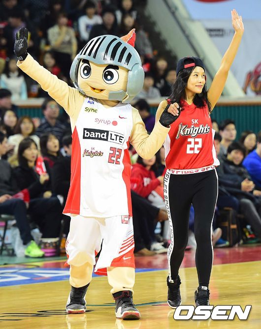 가수 유리가 시투자로 나서 경기장으로 들어서고 있다.