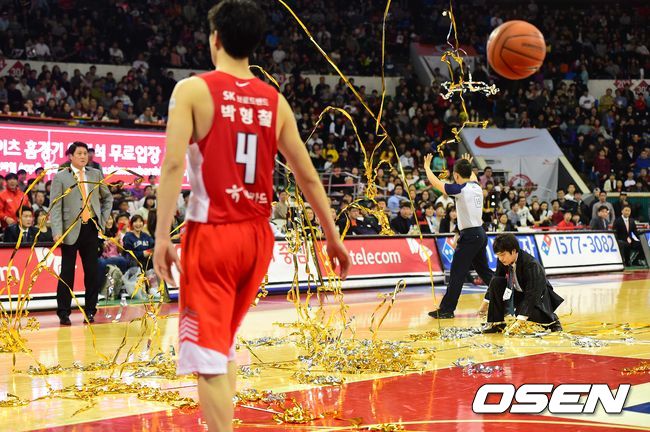 4쿼터 경기 종료 1분여를 남기고 코트 내로 폭죽이 터져 경기가 중단되고 있다./dreamer@osen.co.kr