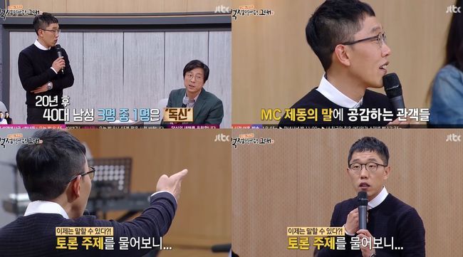 20일 첫방송된 JTBC '김제동의 톡투유'가 연애를 주제로 이야기를 나눴다. 토크 콘서트 형식으로 진행된 이날 방송에서 김제동은 폭발적인 입담으로 방청객들과 시청자들을 사로잡았다.