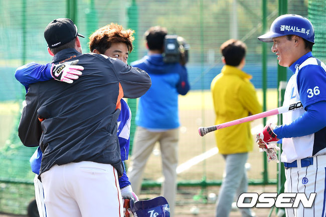 연습경기에 앞서 한화 탈보트가 박석민, 이승엽과 인사를 나누고 있다.