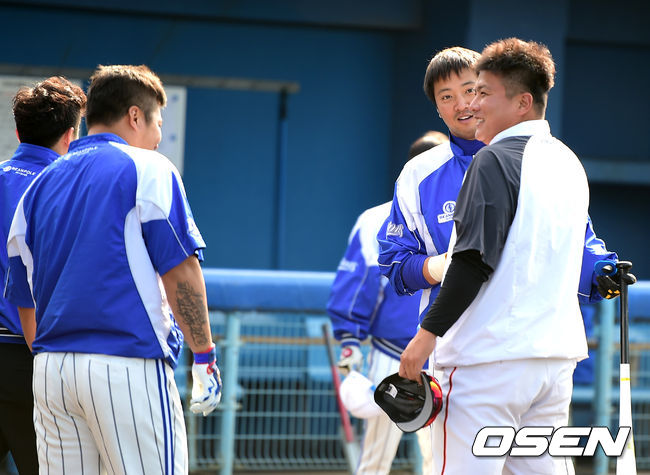 연습경기에 앞서 한화 김태균이 인사를 하러 훈련장에 들어서자 삼성 최형우, 채태인이 김태균의 살빠진 모습에 놀라고 있다.