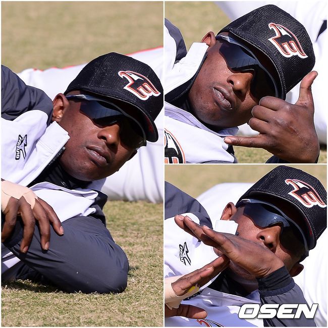 연습경기에 앞서 한화 모건이 몸을 풀며 취재진에 포즈를 취하고 있다.
