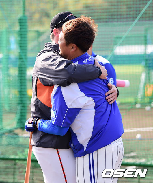연습경기에 앞서 한화 탈보트와 삼성 박한이가 인사를 나누고 있다.