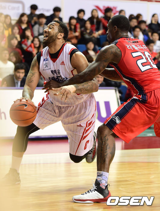 2쿼터, 오리온스 길렌워터가 모비스 라틀리프 수비를 뚫고 있다.