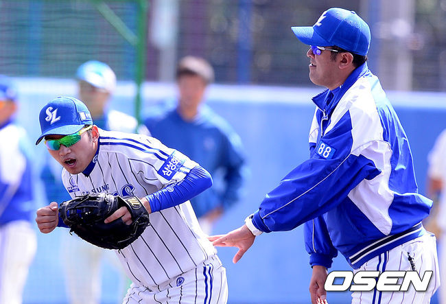경기에 앞서 삼성 박해민과 카도쿠라 코치가 장난을 치고 있다.