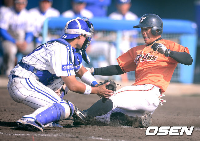 8회초 2사 만루에서 한화 2루 주자 박노민이 최진행의 1루땅볼에 홈에서 태그아웃당하고 있다.