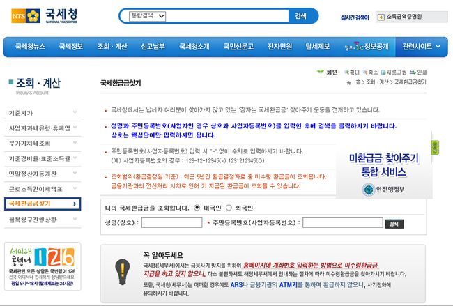 국세청 환급금 조회방법은 간단하다. 개인은 본인의 이름과 주민등록번호, 사업자는 상호와 사업자등록번호를 입력하면 최근 5년치를 조회할 수 있다. 또 미수령 환급금 회수에 대한 관심이 쏠리는데 역시 국세청 환급금 조회방법은 국세청 홈페이지를 통해 가능하다. 국세환급 찾기 코너를 통해 간단한 조회가 가능한 것이다.