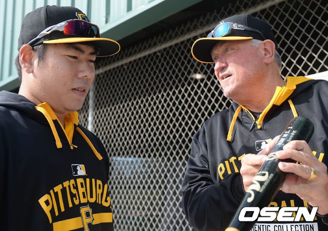 강정호가 클린트 허들 감독과 이야기를 나누고 있다.