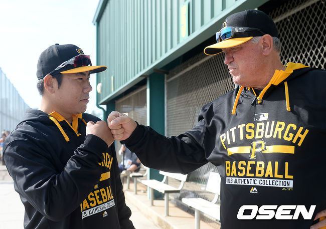 강정호가 클린트 허들 감독과 주먹인사를 하고 있다.