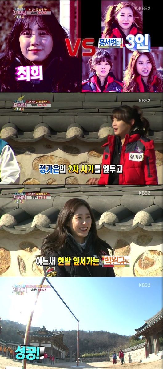 최희는 22일 오전 방송된 KBS 2TV '출발 드림팀 시즌2'(이하 '출발드림팀2')에서 정가은과의 6m 서든데스 결과 승리를 거뒀다.