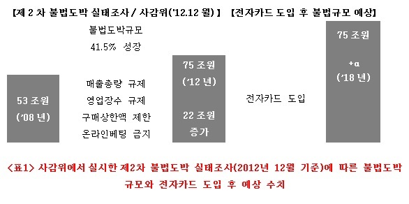 지난 2008년 53조원에 달했던 불법도박의 규모는 매출총량제와 영업장 수 제한, 구매 상한액 조정, 온라인판매 금지 등 합법사업에 대한 과도한 규제가 시행되면서 4년 사이에 무려 22조원이 늘어난 75조원으로 급증했다. 만약 이대로 전자카드가 전면 도입되어 합법사업에 대한 규제가 더욱 강해질 경우, 이에 따른 풍선효과로 인해 2018년의 불법도박 규모는 겉잡을 수 없이 늘어날 것으로 예상되고 있다.