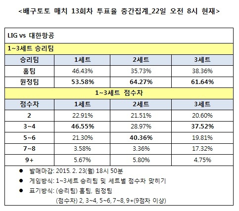 [배구토토] 국민체육진흥공단(www.kspo.or.kr)이 발행하는 체육진흥투표권 수탁사업자 공식 인터넷 발매사이트 베트맨(www.betman.co.kr)은 오는 23일에 구미박정희체육관에서 열리는 2014-2015시즌 V-리그 LIG-대한항공전을 대상으로 하는 배구토토 매치 13회차 게임 투표율 중간집계 결과, 배구팬들은 대한항공이 LIG를 상대로 우세한 경기를 펼칠 것으로 예상했다.