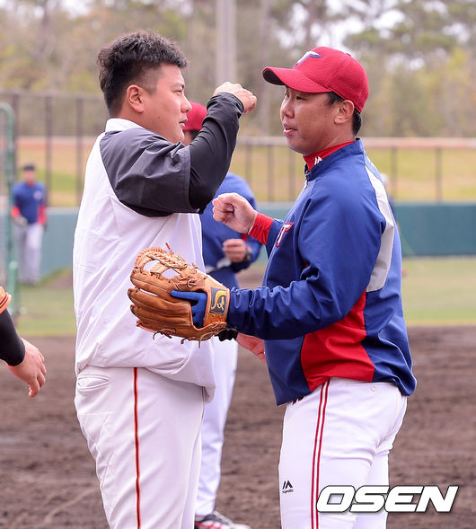 연습경기에 앞서 한화 김태균과 KIA 이범호가 인사를 나누고 있다.