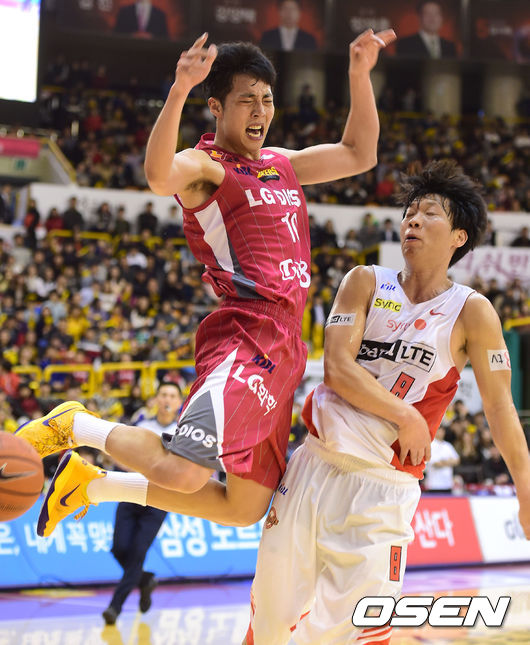 3쿼터, LG 정창영이 SK 박상오에게 파울을 유도하고 있다.