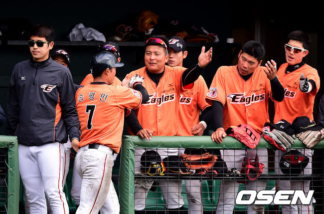 7회초 1사 만루에서 한화 송광민이 오윤의 밀어내기 볼넷으로 홈을 밟고 동료선수들과 하이파이브를 하고 있다.