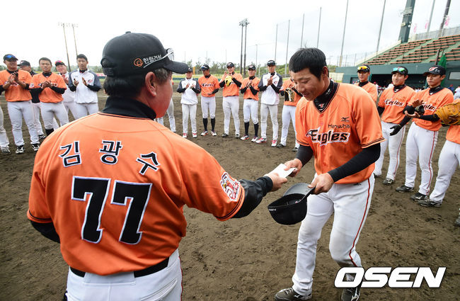 경기후 한화 김광수 코치가 권용관을 수훈선수로 선정하며 상금을 건네고 있다. /jpnews@osen.co.kr