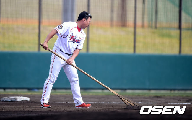 클리닝 타임에 KIA 이범호가 그라운드를 정리하고 있다. /jpnews@osen.co.kr