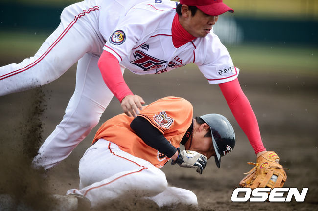 3회초 무사 1루에서 한화 권용관이 정범모의 유격수 라인드라이브에 귀루하며 태그아웃 당하고 있다. KIA 1루수는 이인행./jpnews@osen.co.kr